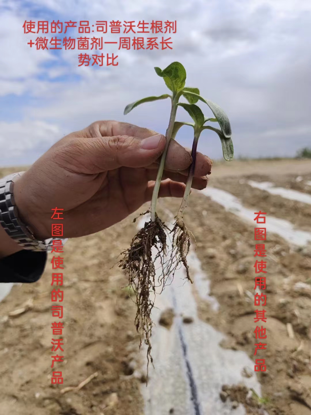 新疆葵花沖施司普沃“三活三抗”套餐,根系發(fā)達健壯,根多根壯,植株長勢健壯,而使用其他產(chǎn)品根系相對少,植株相對較瘦弱,對比明顯。